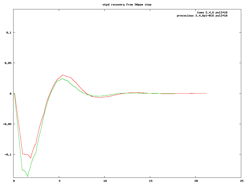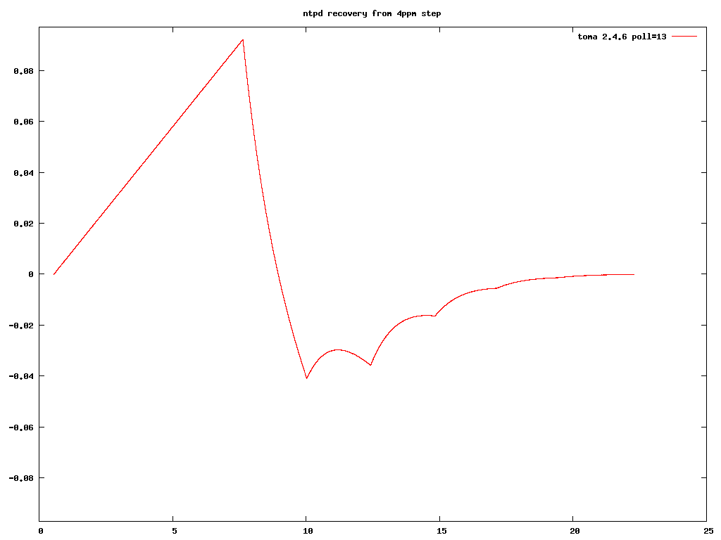 below: ntpd reference implementation, with the default kernel loop, and poll=10. ?: This looks like the 6% overshoot Mills talks about, though that is more like 20%.