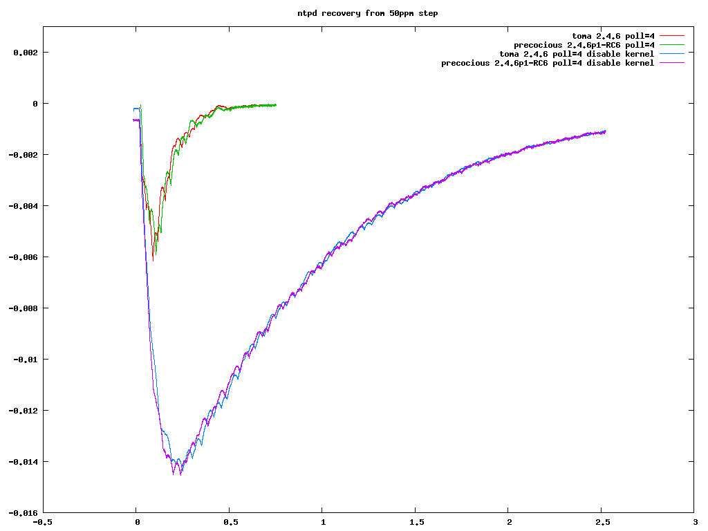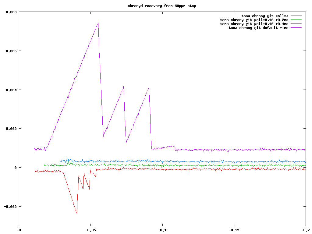 below: chronyd with various settings. Settling time in this particular scenario (sync against a low latency high performance clock) is very fast.